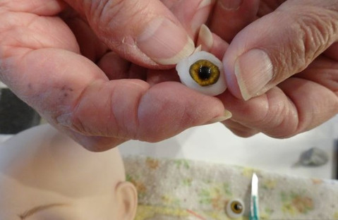 For example, the photo of Molly's porcelain head (10" tall, below) shows how the eye is measured. 8mm eyes are generally suitable for dolls 10" in height.