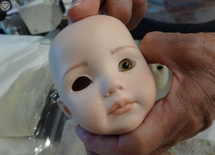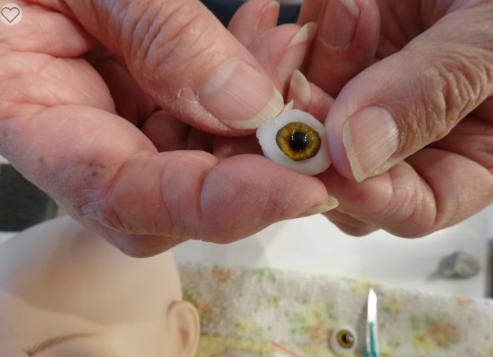 The very first thing we’ll need to do is attach the head to the plate. Oh! Right! The eyes! How to attach them… I forgot… I didn’t take photos, so I’ll show you using another doll, but the process is identical and quite simple. These are my photos as well, taken a few years ago when I was inserting eyes for the first time in my life. My teacher Delores is helping me in the photos.
